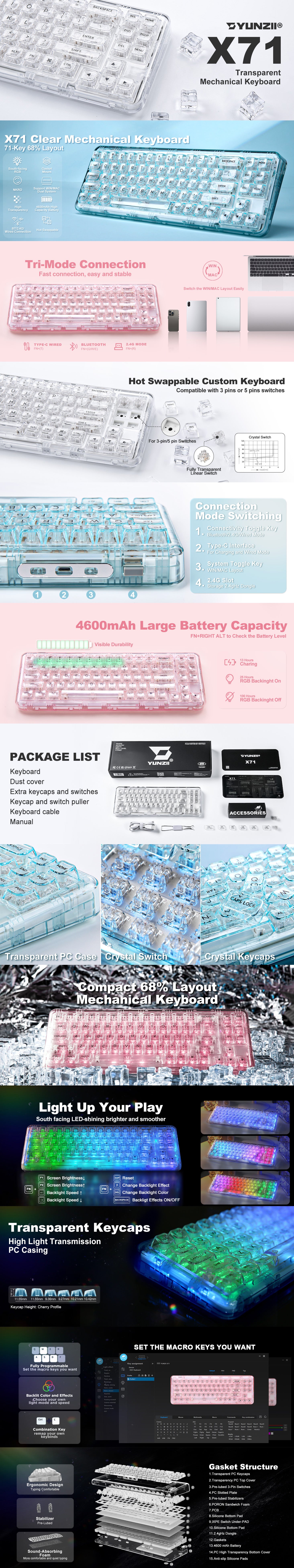 YUNZII X71 Transparent Wireless Gasket Mechanical Keyboard